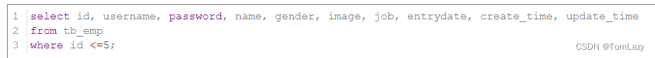 案例2:查询 id小于等于5 的员工信息 |