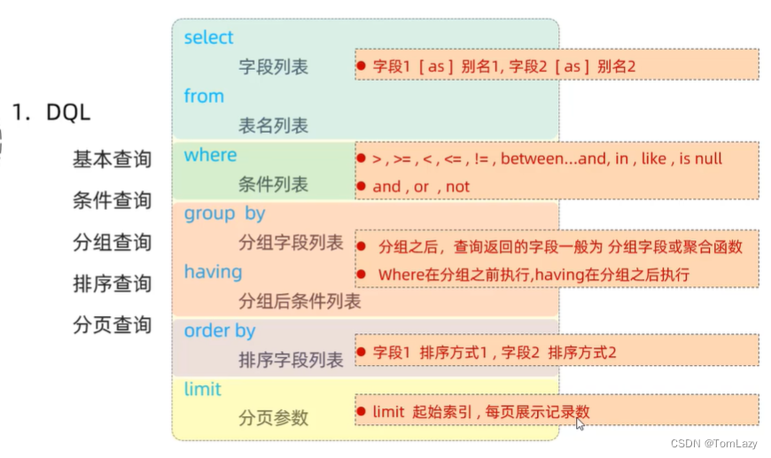 MySQL(DQL & 多表设计),内容主要包括:select的基本查询、条件查询(where)、分组查询(group by)、排序查询(order by)、分页查询(limit);多表设计(一对多、一对一、多对多)等。