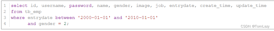 案例7:查询 入职时间 在 '2000-01-01' (包含) 到 '2010-01-01'(包含) 之间 且 性别为女 的员工信息 |