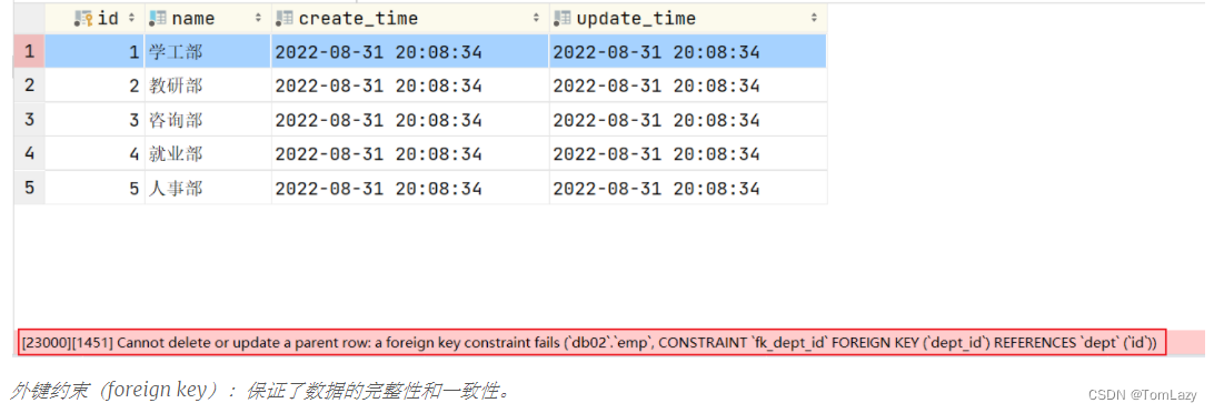 当我们添加了外键之后,再删除ID为1的部门,就会发现,此时数据库报错了,不允许删除,此时仅允许删除没有被关联的id数据: