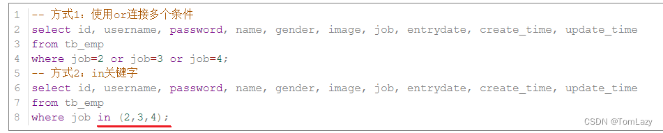 案例8:查询 职位是 2 (讲师), 3 (学工主管), 4 (教研主管) 的员工信息 |