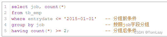 案例2:查询入职时间在 '2015-01-01' (包含) 以前的员工 , 并对结果根据职位分组 , 获取员工数量大于等于2的职位 |