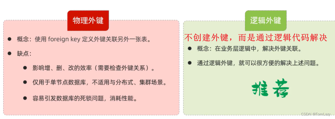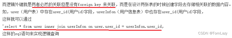 逻辑外键:又叫事物外键,不使用foreignkey,使用语法(代码)上产生逻辑关联而产生的外键;