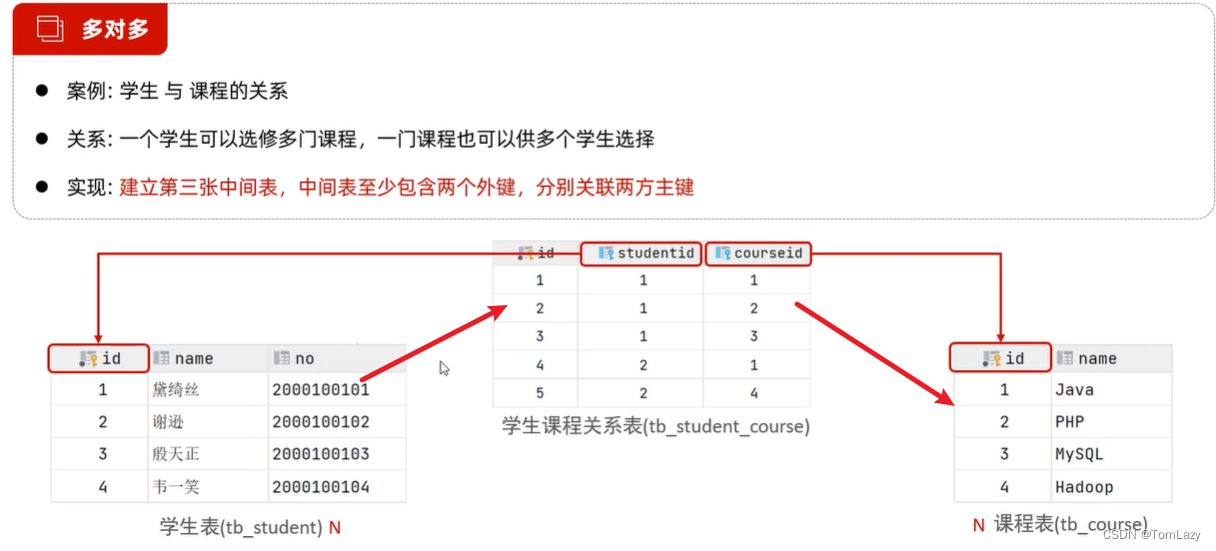 多对多的关系在开发中属于也比较常见的。比如:学生和老师的关系,一个学生可以有多个授课老师,一个授课老师也可以有多个学生。在比如:学生和课程的关系,一个学生可以选修多门课程,一个课程也可以供多个学生选修