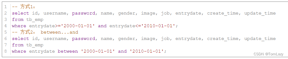 案例6:查询 入职日期 在 '2000-01-01' (包含) 到 '2010-01-01'(包含) 之间的员工信息 |