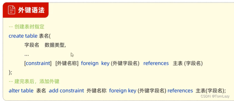 解决方法:我们就可以通过数据库中的 外键约束 来解决 外键约束:让两张表的数据建立连接,保证数据的一致性和完整性。 对应的关键字:foreign key