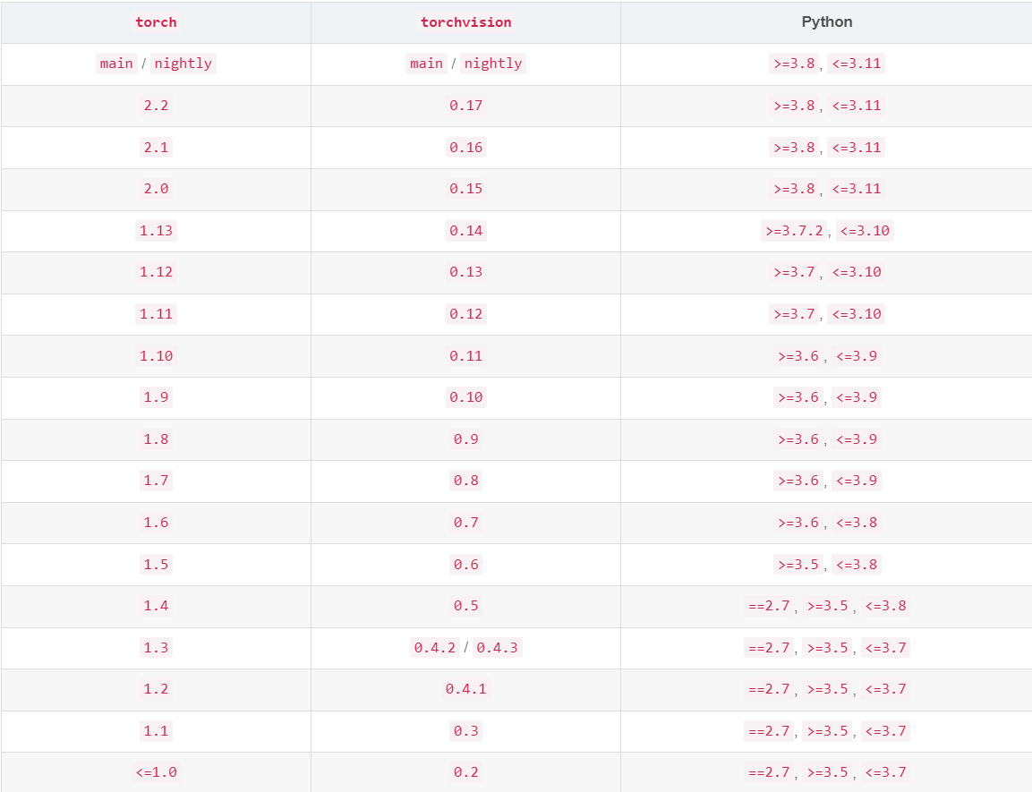 下表来自Pytorch在Github官方版本表,需要对应torch与python环境的兼容。