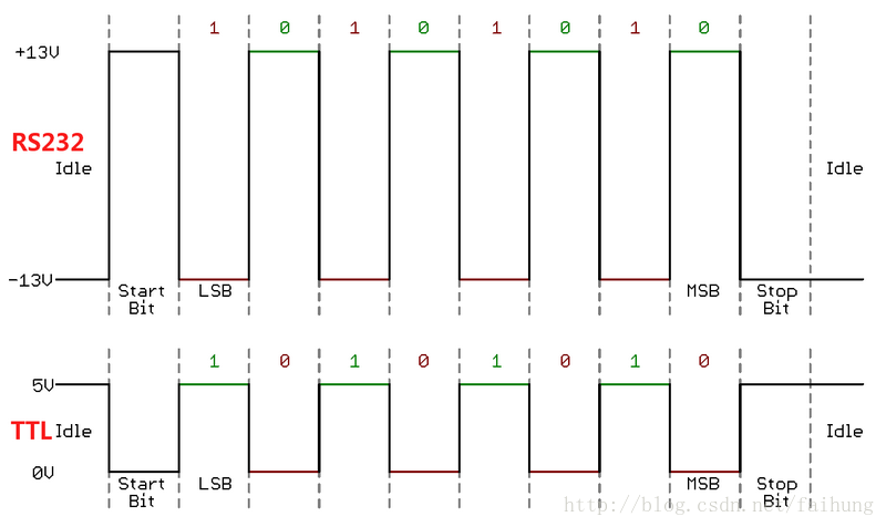 对于同样传输0b01010101来说,RS232和TTL的时序对比: