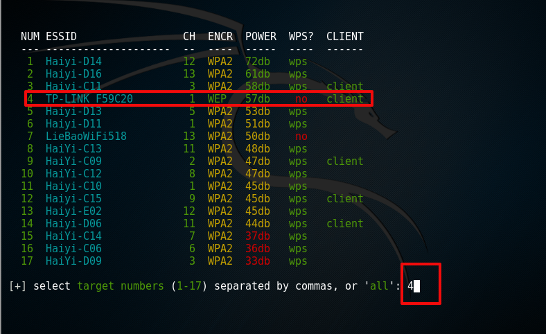 让他先扫描,当CLIENT下面出现client时按"CTRL+C":他会提示你要你输入编号,这里我就输入"4",因为4采用的是WEP加密的。