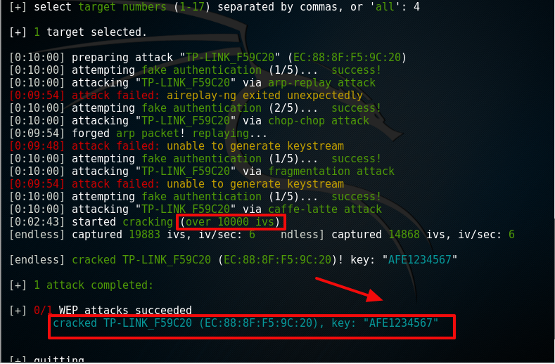 - 停止任何攻击与Ctrl + C,选项继续,移动到下一个目标,跳到破解或退出