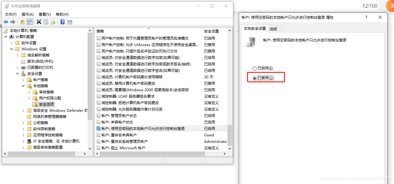 找到 计算机配置--windows设置--安全设置--本地策略--安全选项--帐户: 使用空密码的本地帐户只允许进行控制台登录