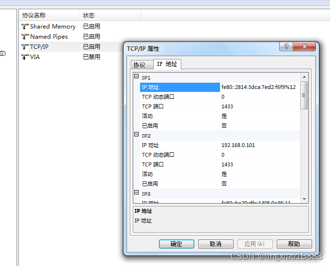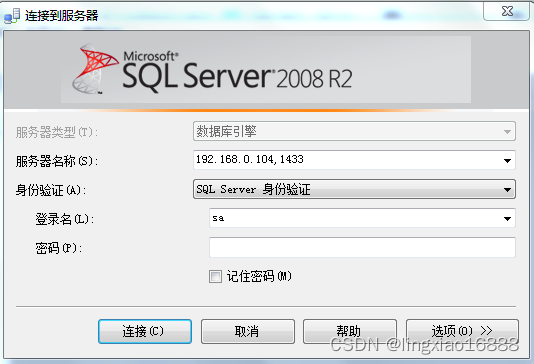 服务器名称:192.168.0.104,1433192.168.0.104:SQLServer所在远程PC的IP,:逗号分割IP与端口号1433:SQLServer所使用的端口号(默认为1433),当使用默认端口号时可以省略。
