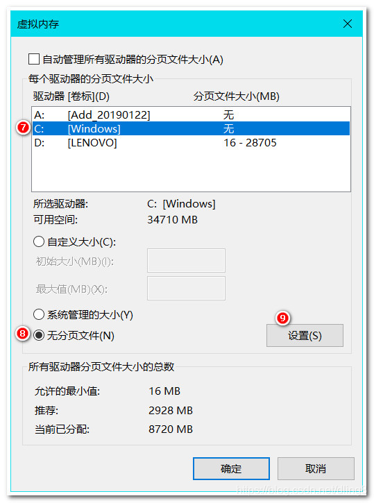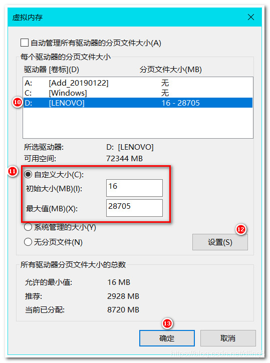 11步中需根据自身磁盘容量设置最大值;也可以选择系统管理的大小(系统托管)