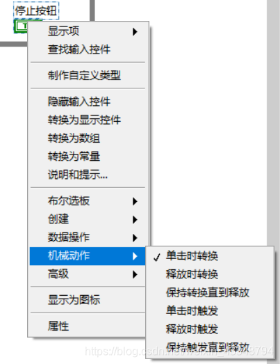 4.添加发送按键和停止按键:前面板右击–>布尔–>选择自己喜欢的按钮。将循环条件端子与停止按钮连接,发送按钮连接判断条件。