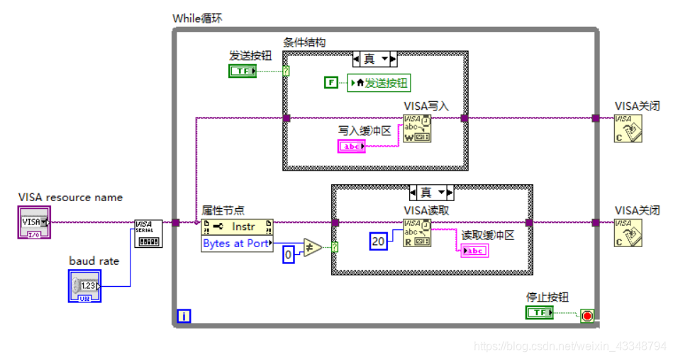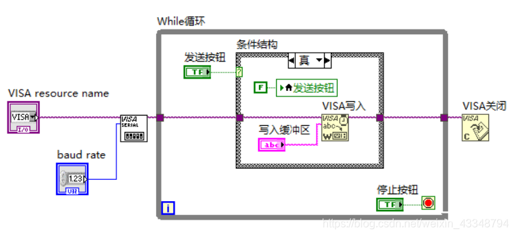 5.添加VISA写入和VISA关闭,在VISA写入添加写入缓冲区。写入缓冲区写入的就是你要发送的数据。注意:条件结构里要添加发送按钮的局部变量,并且与布尔常量F相连,不然发送数据时,会一直重复发送写入的数据。添加局部变量是为了按一次按键,发送一次数据。
