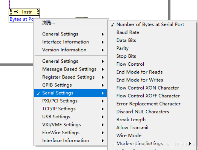2.设置通信函数:函数–>编程–>仪器I/O–>串口–>VISA配置串口。右击两次可查看VISA配置串口默认配置。