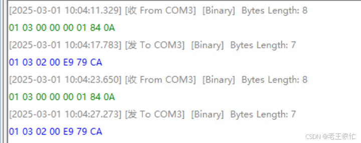 b/接收的字节为16进制的,共7个:01/03/02/00/E9/79/CA