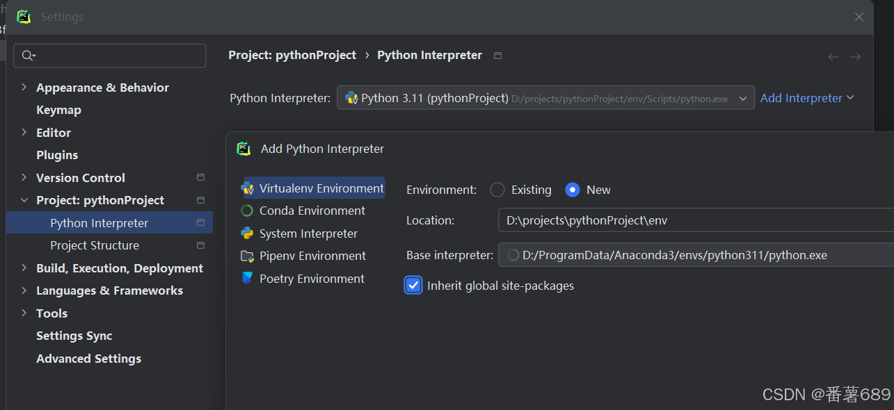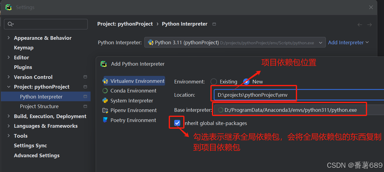 如果想要添加依赖包就使用终端添加,pycharm的添加依赖提示点了没用!!!。原理就是在全局添加了依赖,而由于之前的配置,全局的依赖也会复制到项目依赖包下,同样也能使用。激活了那个环境,依赖就会下载到对应环境名的目录下。