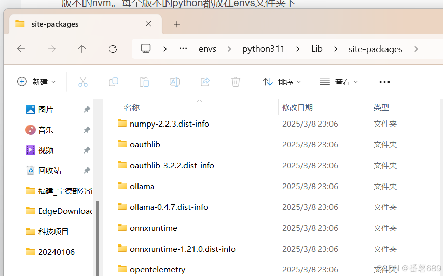 python.exe是代码编译器,conda可以理解为用于管理python版本的一个东西,类似用于管理node版本的nvm。每个版本的python都放在envs文件夹下,每个python环境下的依赖都放在./Lib/site-packages下,相当于node中的node_modules,只不过这里的是全局的。
