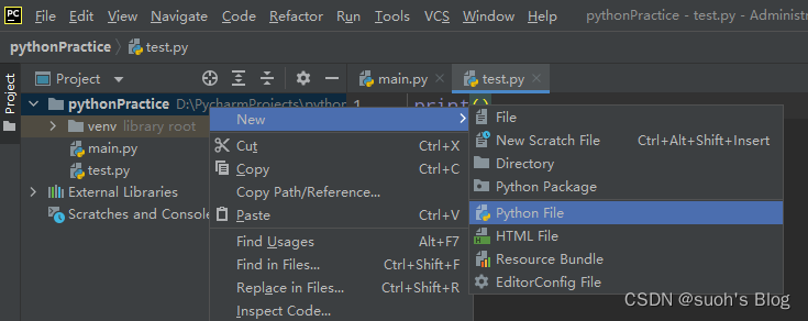 在pycharm中新建一个pythonPractice工程后,然后选中pythonPractice右键进行新建python file.
