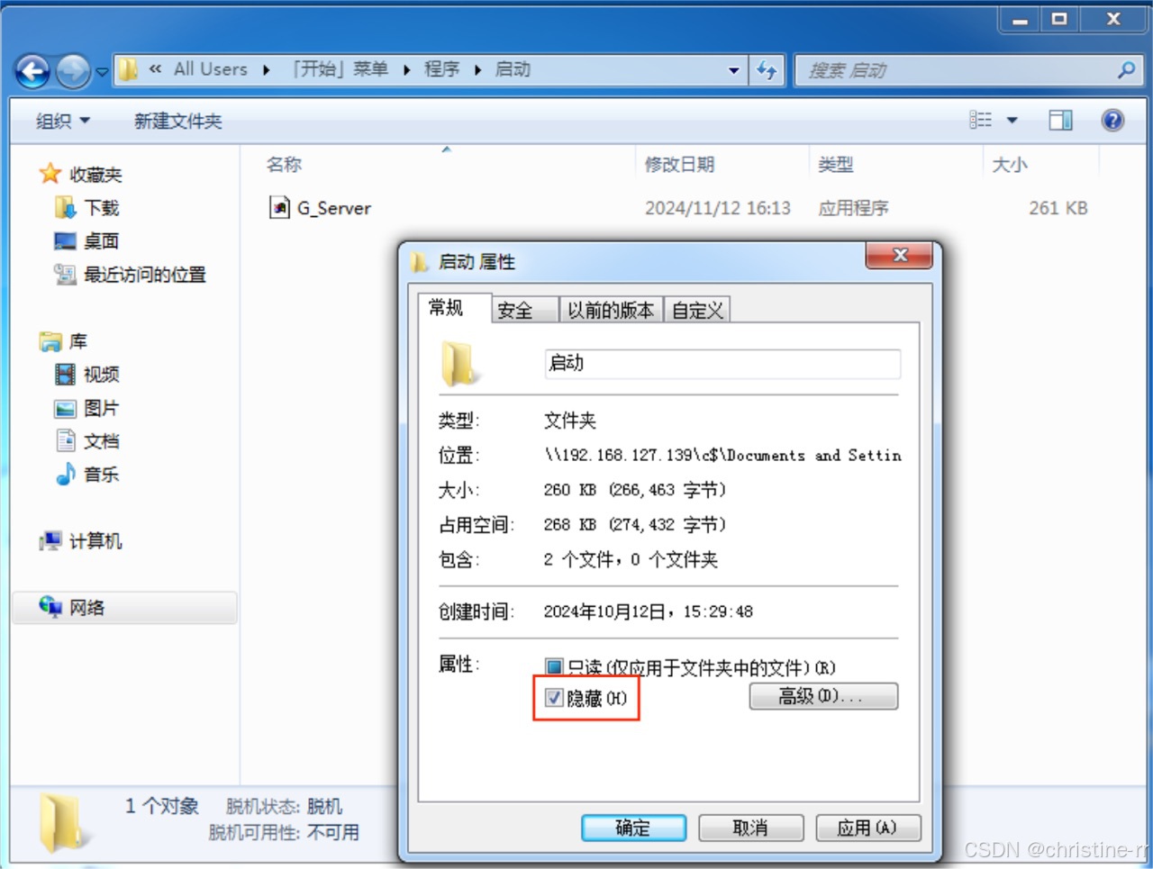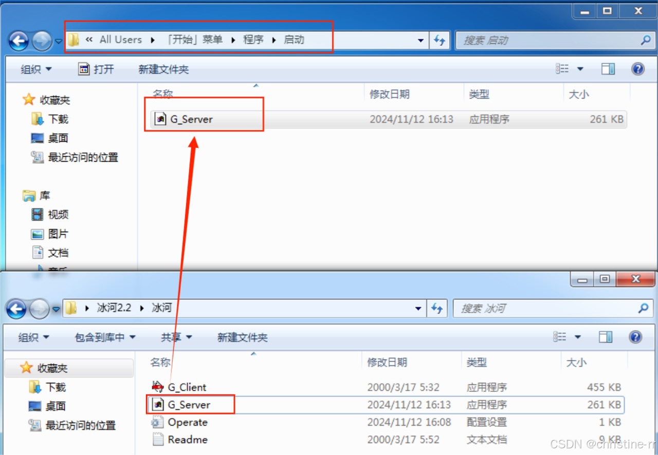 - 将冰河木马的服务器端拖入靶机中“\\192.168.127.139\c$\Documents and Settings\All Users\「开始」菜单\程序\启动”目录下: