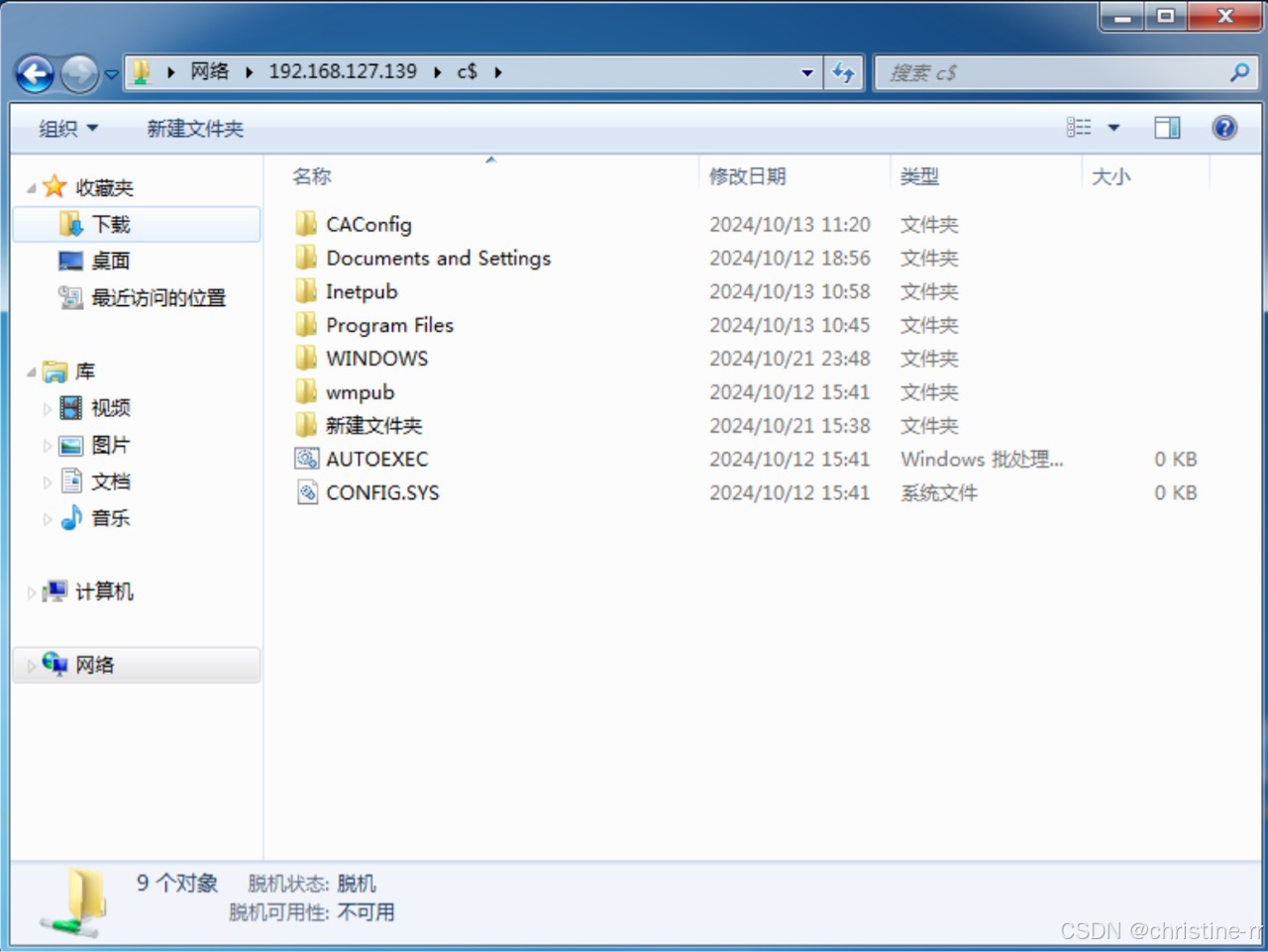 ① 在攻击者Windows 7 中,打开文件资源管理器,在地址栏中输入\\192.168.127.139\c$