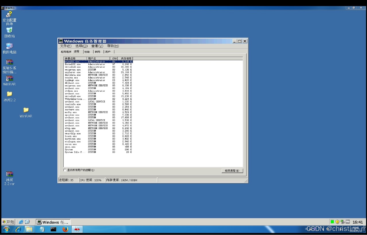 - 在靶机Windows Server2003中打开任务管理器(Ctrl+Shift+Esc),可以看到木马服务端程序“KERNEL32.exe”已经启动。