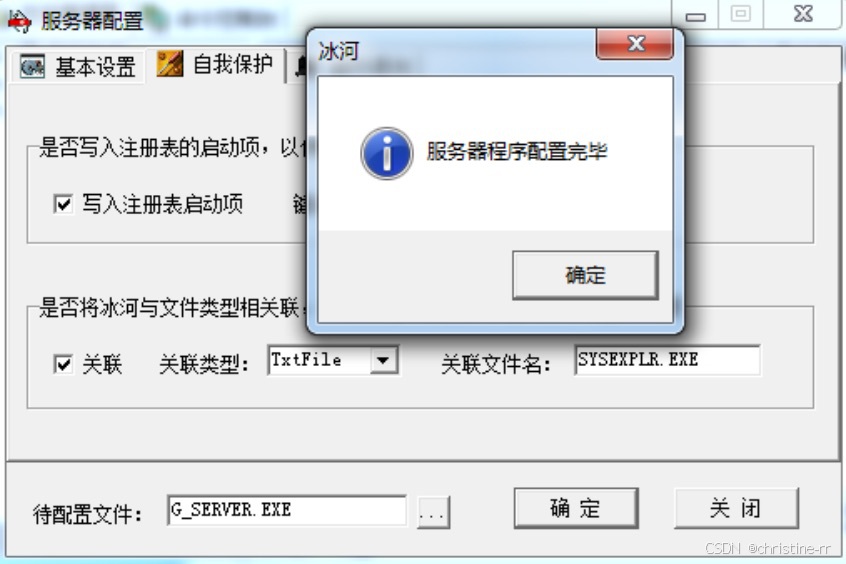 - 点击“确定”开始配置,完成后会显示“服务器程序配置完毕”,即在客户端相同目录下生成服务端程序(在攻击者中查看)