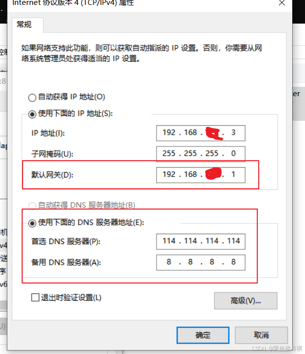 图中画框部分要自己填好,DNS用我这个就可以,默认网关需要前面三个都是和你虚拟机的ip地址一样!或者说和上面的那个ip地址一样,最后面和我一样是1就行。