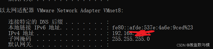 图中画框部分要自己填好,DNS用我这个就可以,默认网关需要前面三个都是和你虚拟机的ip地址一样!或者说和上面的那个ip地址一样,最后面和我一样是1就行。接下来你在主机的终端输入ipconfig之后就会有默认网关了!接下来要把你虚拟机的默认网关也要设置成这个才行!接着你再ping 8.8.8.8应该就没问题了!可以看到图中的默认网关是没有的!所以我们要启动这个网关。
