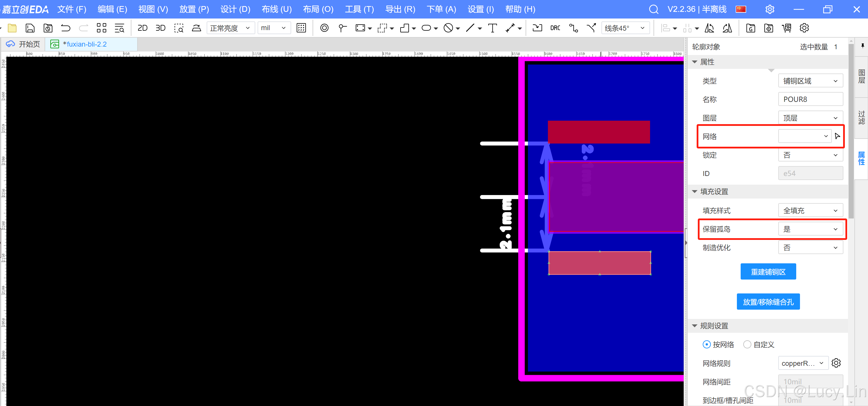 EDA里面顶层铺铜铺不上,如果面积比较小,可以将需要铺铜的区域设置为“保留孤岛——是”,即可以铺铜成功。
