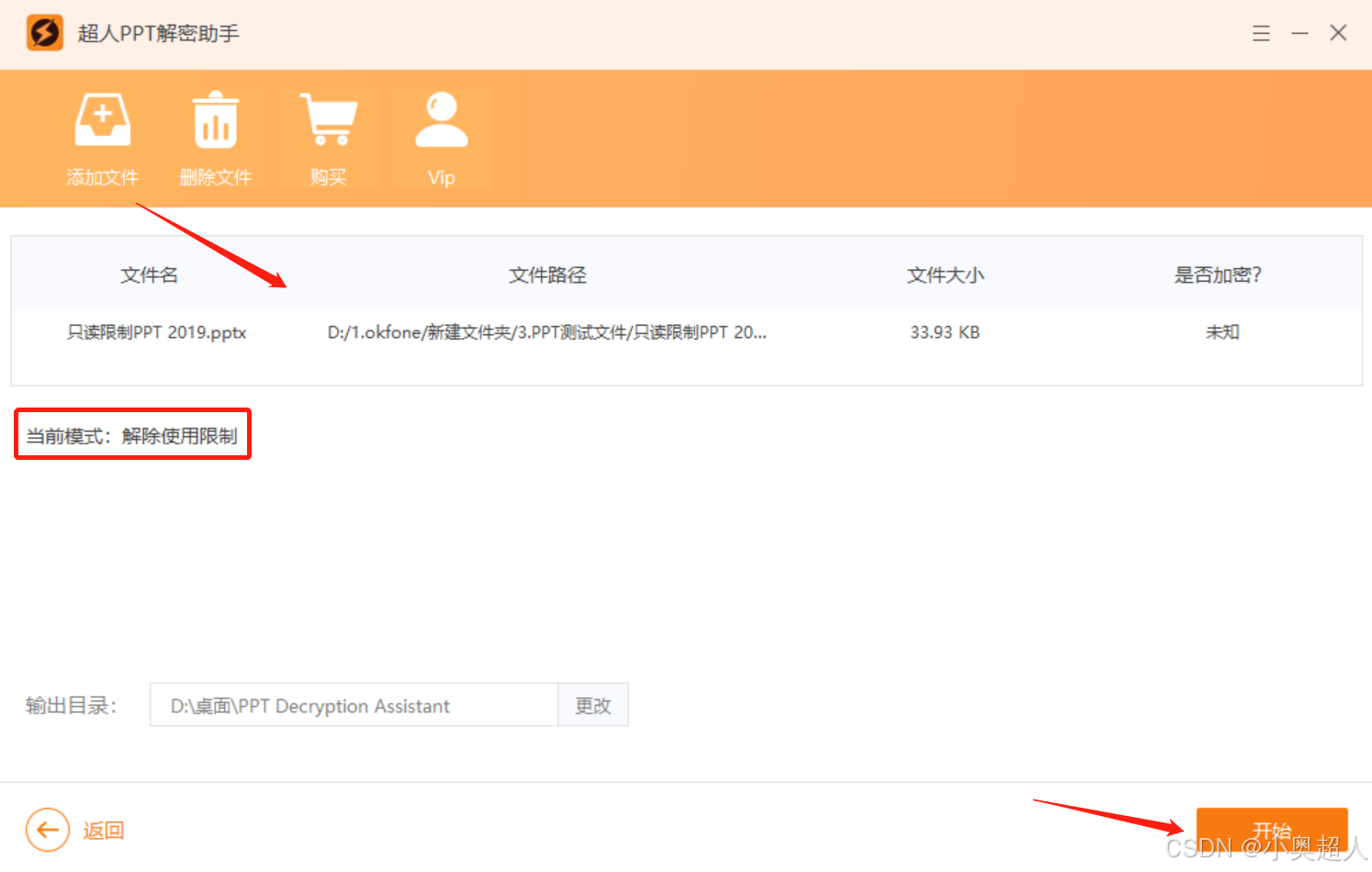 如果是忘记了修改权限密码,同样的,因为是需要我们自己找回密码的,如果自己尝试了很多密码没有效果,也是可以使用上面的工具来解决问题,工具中解除限制功能,导入PPT文件之后,点击开始就可以取消修改权限了