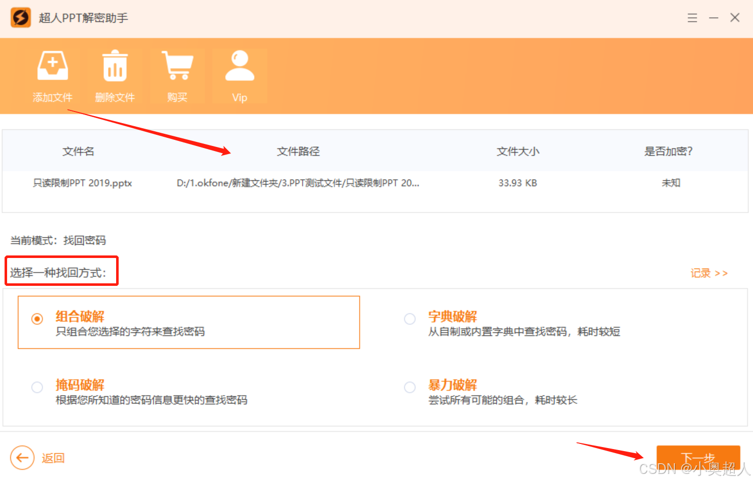 其实在我们加密的时候,应该有注意到PPT给的提示,密码区分大写并且忘记密码无法恢复,所以如果上面的方法没有效果,我们就只能自己尝试找回密码。找回密码的方法,可以是自己经常使用的密码,也可以使用工具帮我们找回。比如超人PPT解密助手中找回密码功能,提供了四种解决思路帮助我们找回密码。