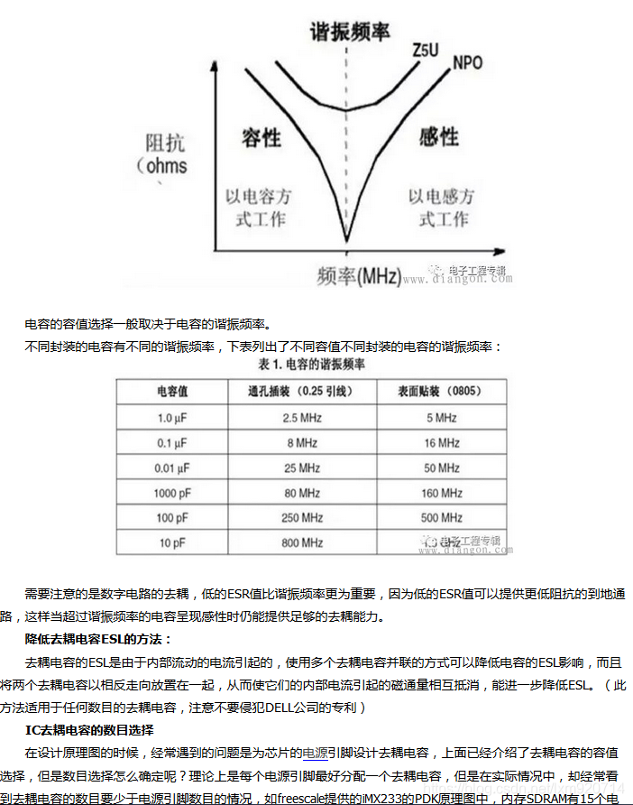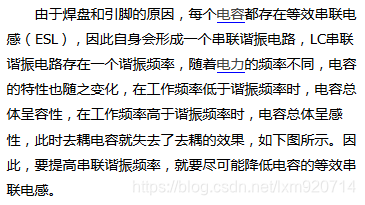 理论上,电容的容量越大,容抗越小,滤波效果就会更好。但是,电容自身和引线会产生寄生电感(有电流的地方就有寄生电感)。我们一般使用SMT,自身的电感就很小了,主要是引线上的寄生电感。这时就要考虑LC振荡,且是LC串联谐振。