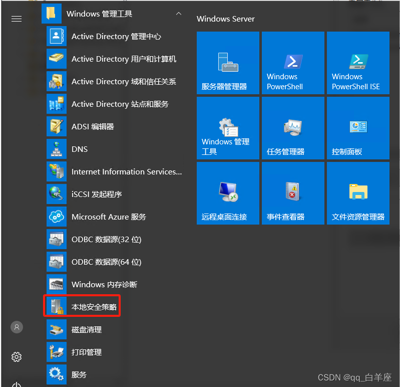 - 登录域控服务器,点击 windows管理工具->本地安全策略。或点击 开始/运行,输入“secpol.msc”