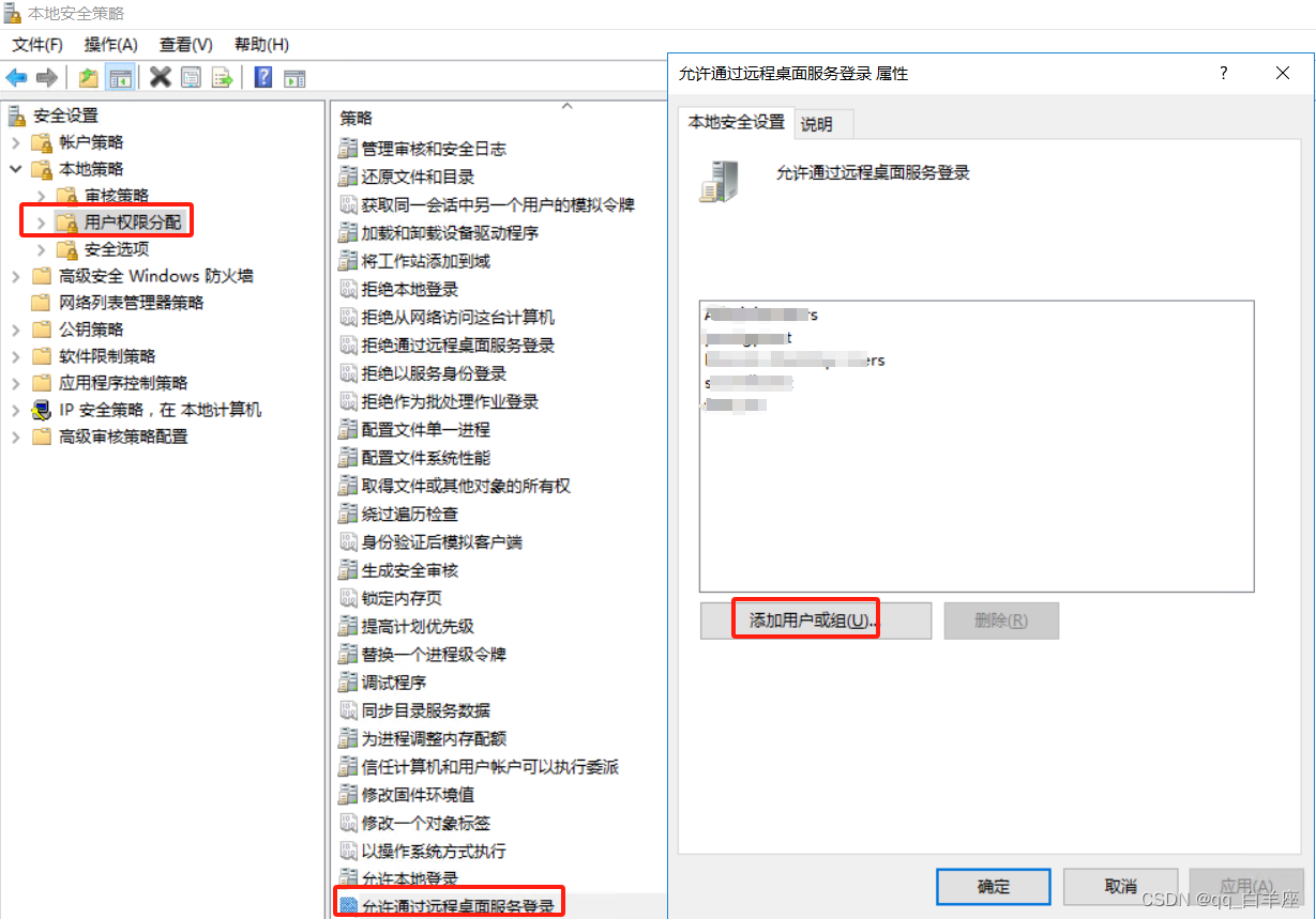 - 点击用户权限分配,在右侧窗格中找到“允许通过远程桌面服务登录”,双击打开,添加该没有授权远程登录的用户名,重启电脑即可。