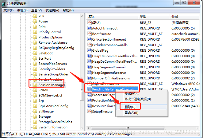 在注册表左侧目录栏中找到如下位置:“HKEY_LOCAL_MACHINE——SYSTEM——CurrentControlSet——Control——Session Manager”然后在右侧选择删除“PendingFileRenameOperations”项即可。
