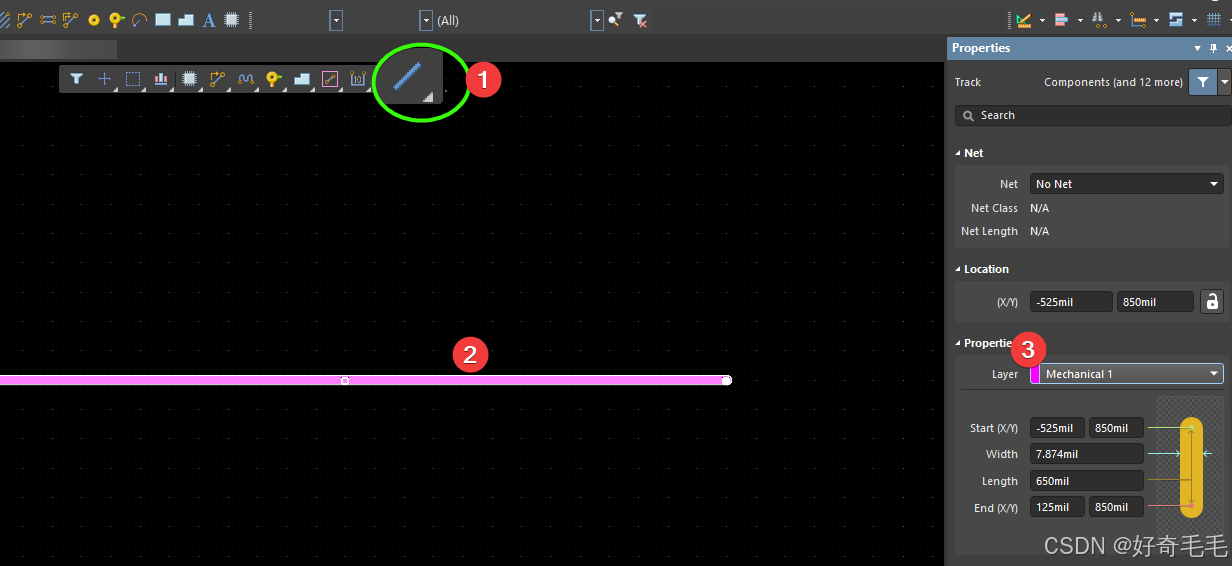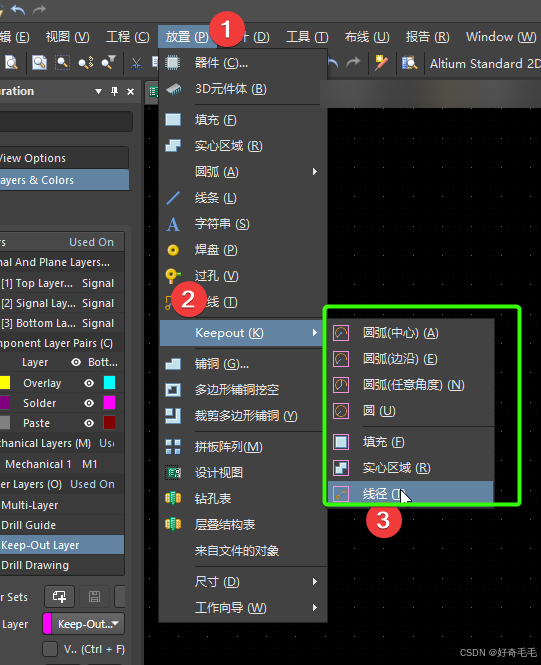 不知道现在的你是不是和我一样,使用①划线,双击②,在③中无法找到keep out层呢?(如果你和我一样,就请看下文)。