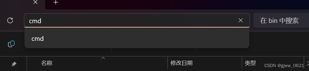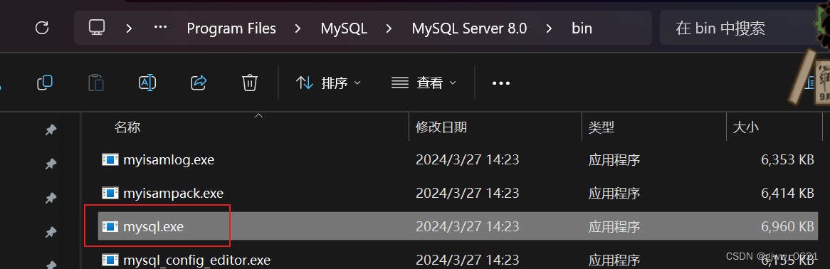 进入MySQL的默认安装目录 C:\Program Files\MySQL\MySQL Server 8.0\bin ,能找到一个 mysql 的文件(用来连接MySQL的客户端的)。在此目录栏里输入cmd,回车。