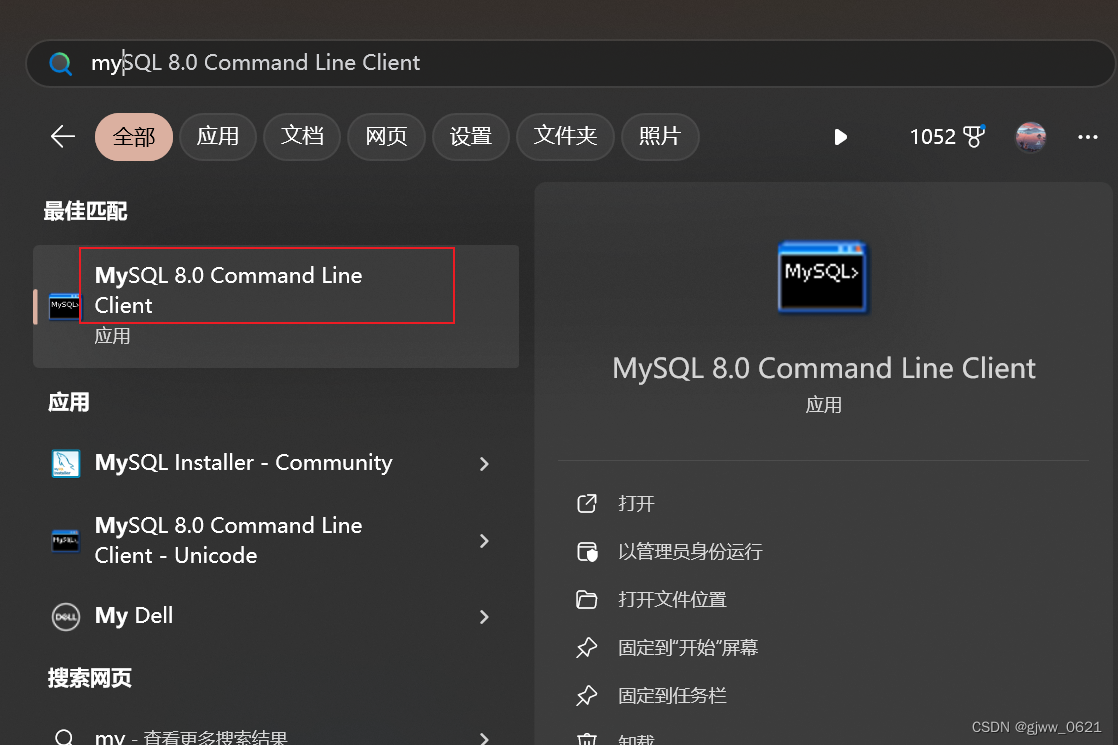直接搜索mysql,找到 MySQL 8.0 Command Line Client(mysql命令行客户端)并打开