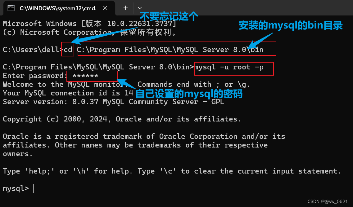 cd xxx:切换文件夹补充2:完整的代码是 mysql -u 用户名 -p密码,默认的用户名是root