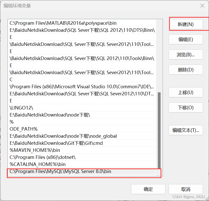 在新跳出的窗口中,点击新建按钮,然后输入mysql的bin文件夹的路径。注意一定是要在bin目录下,因为mysql中的相关.exe文件,都是保存在bin目录之中。