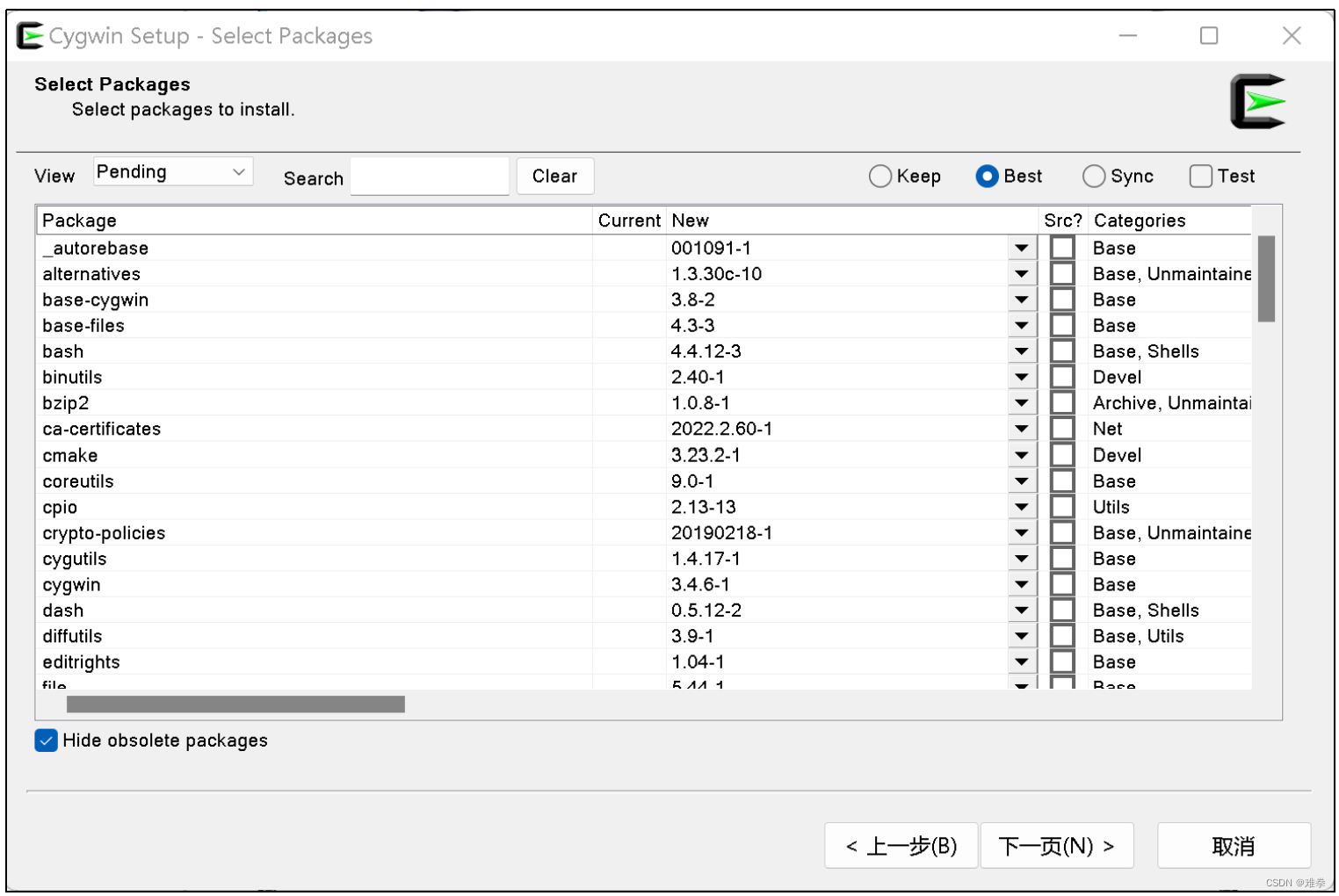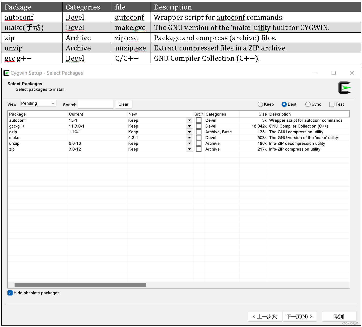 - 根据安装提示,选择需要安装的软件包,完成安装。选择安装Cygwin工具,在Search中搜索要手动安装的工具。