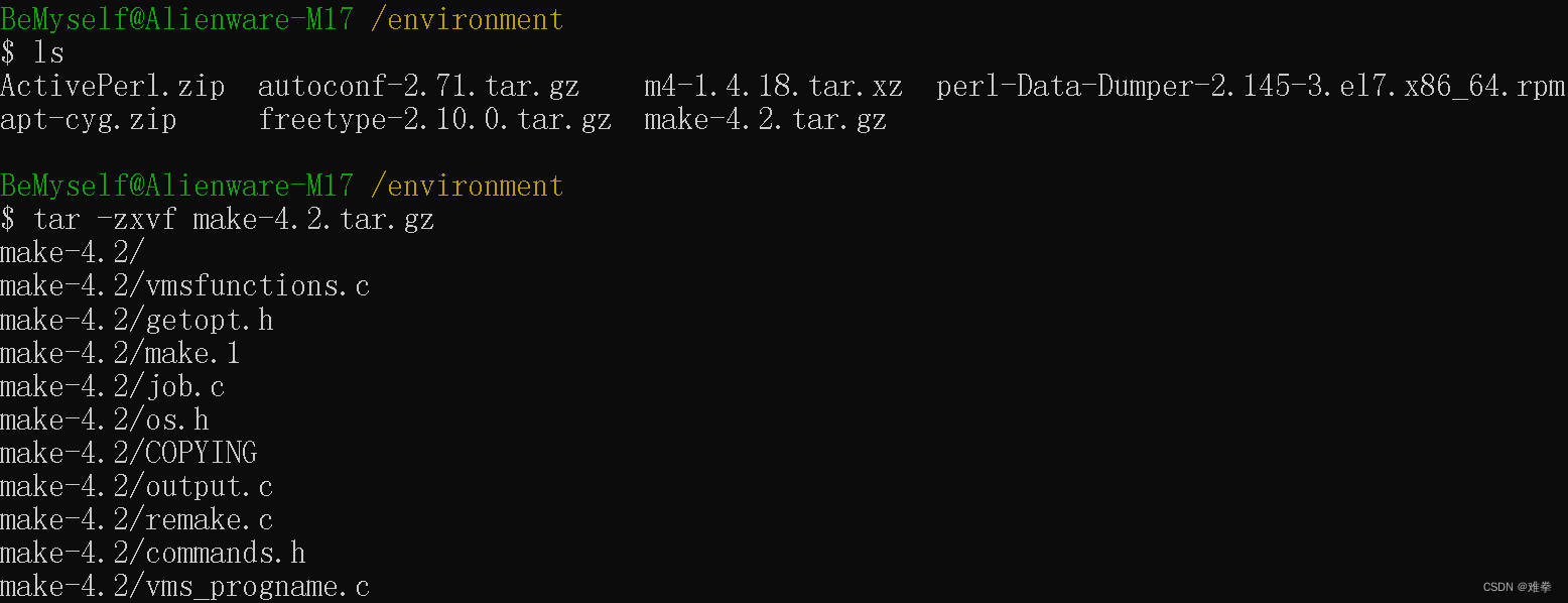 在Cygwin目录下创建一个environment文件夹用来存放手动离线安装的程序包,进入environment解压make-4.2.tar.gz。