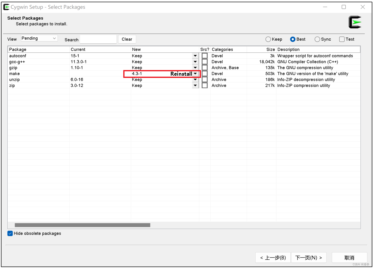 双击setup-x86_64.exe进入Select Packages卸载make4.3-1版本。
