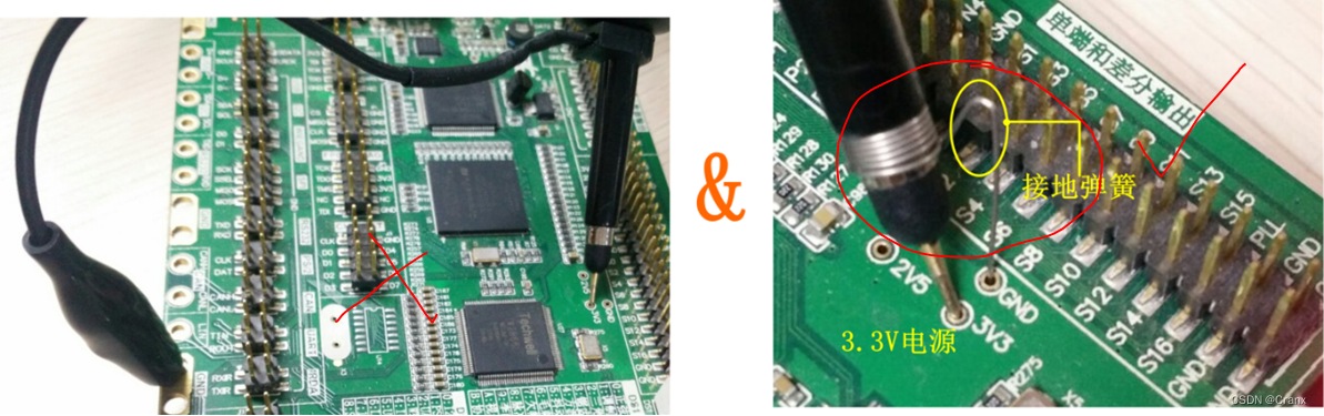 - 将示波器探头的地夹线去掉,换上接地环,用探针靠接需要测试位置,接地环就近连接在裸露的地上,观察输出的波形。