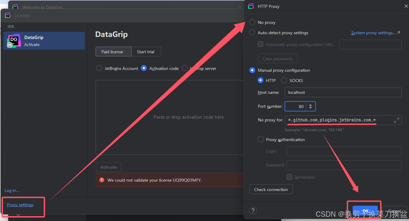 Pycharm,idea,Datagrip等激活后报错We could not validate your license UQ99Q03MFY,可以修改proxy设置