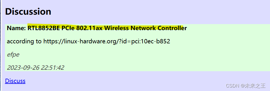 之后查看显示Network开头的:Network。.Devic[10ec:b852]这种形式的语句,其中[10ec:b852]就是我的电脑驱动的固件类型。在linux中用命令进行查看(——用ctrl+alt+T打开窗口)到这步之前都是让没有wifi问题的这个更精准。我们得到name之后就可以进行百度问题啦。之后我就参照了这一篇博客解决了我的问题。1.首先判断自己 的电脑内核的类型,