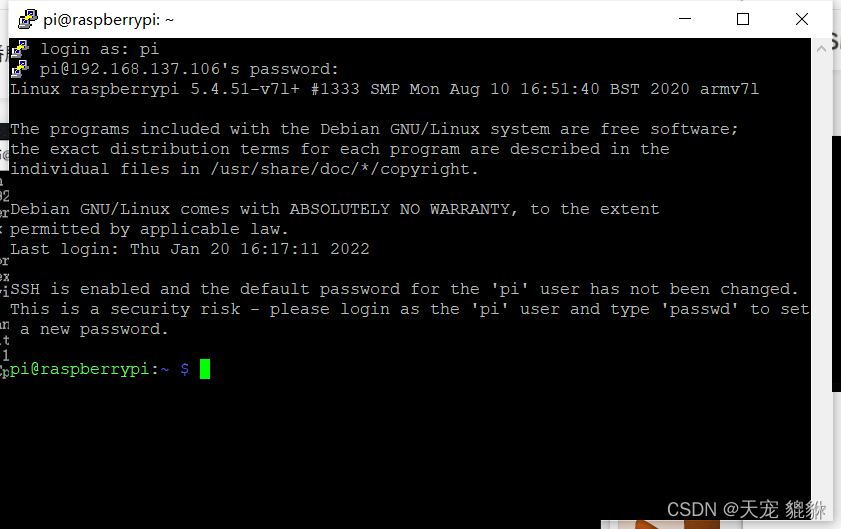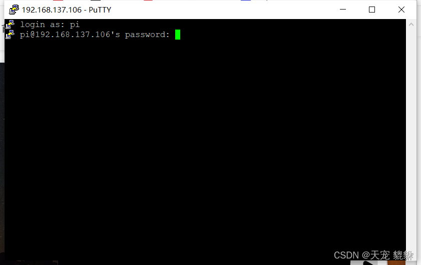 密码:raspberry(注意输入密码时不会显示,确定输入就行,不要重复按)