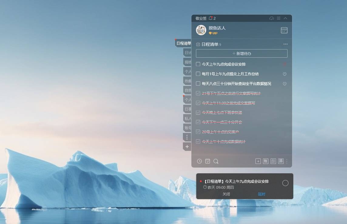 别担心,今天小编要为大家介绍一款功能强大的便签软件——敬业签,它能够一直悬挂在电脑桌面上显示的便签软件,让我们记录的重要信息一目了然,随时可查。在Windows电脑版便签中,我们只需点击界面左上角的个人头像,进入基本设置,勾选“桌面置顶”,它的界面就可以一直悬挂在电脑桌面屏幕的顶层显示,不会被其他页面遮盖。此外,我们也可以在它的待办分类中记录各种待办事项,智能系统会自动为每条待办事项设置提醒时间,